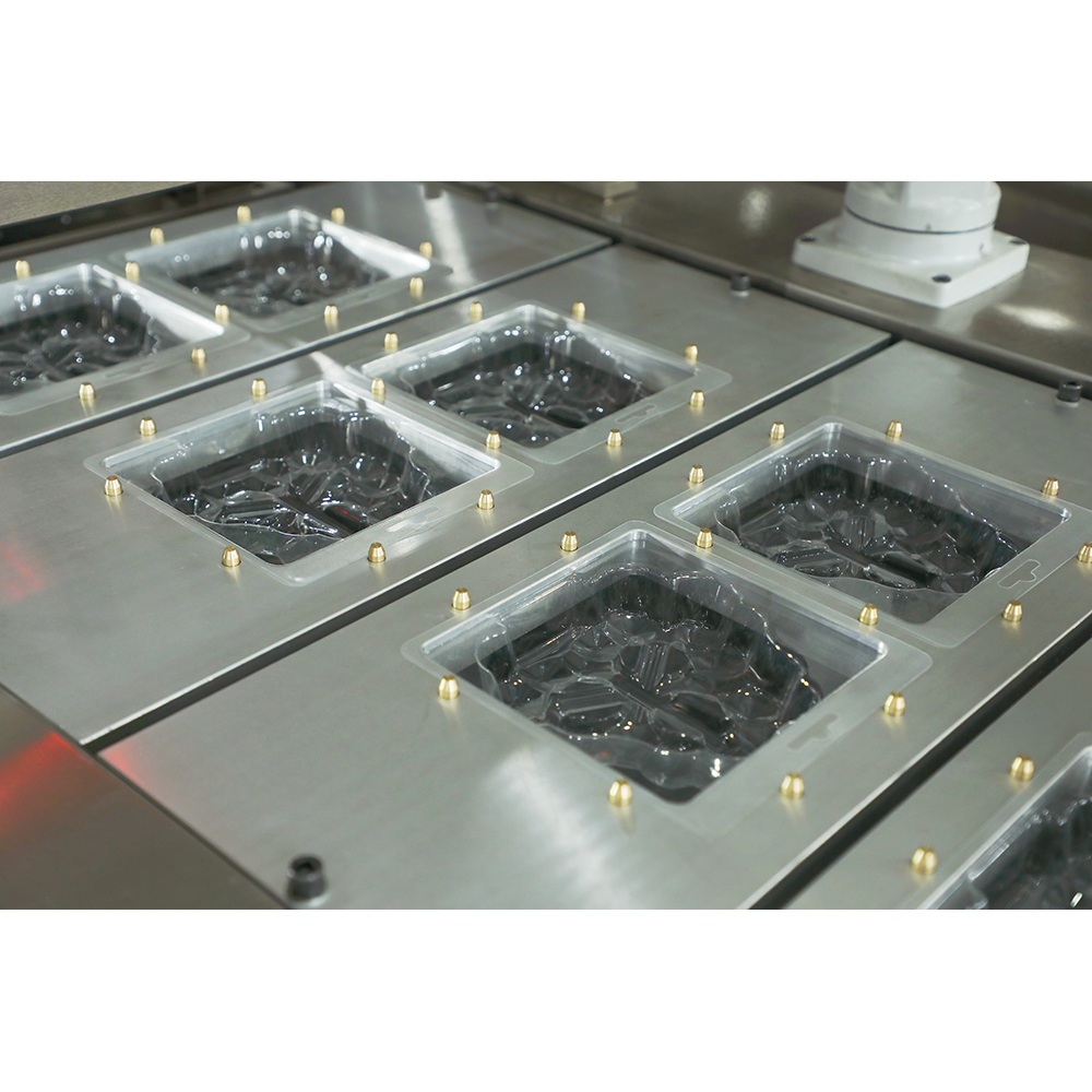 PVC heating→blister forming→servo traction→blister cutting→PVC scrap collection→blister transfer to the chain plate→worker place product→paper card lay down →paper blister hot sealing→product output