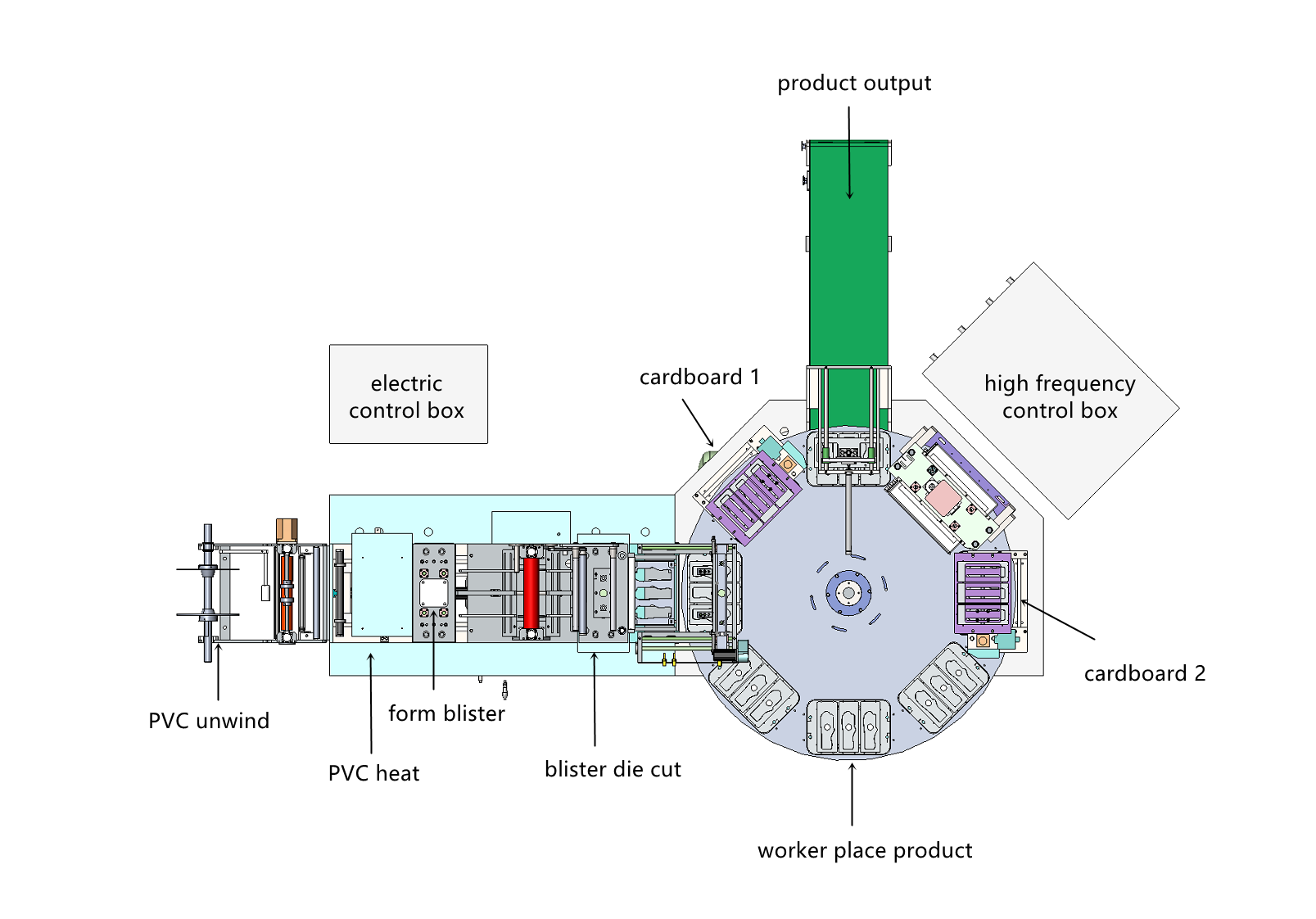 5. bubble shell heat sealing: disc multi-station, high frequency heat sealing, double pressure cylinder to achieve rapid heat sealing of bubble shell and paper card, so as to improve the efficiency of equipment.
